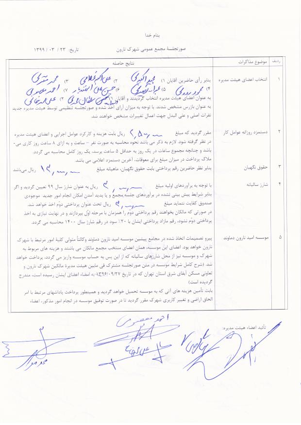 با سلام و درود خدمت مالکین محترم شهرک نارون؛ با اعلام قبلی که از طریق گروه واتساپ شهرک نارون صورت گرفته بود، در صبح امروز بیست و سوم خردادماه در محل شهرک دورهم جمع گشتیم و ضمن مرور عملکرد گذشته هیئت مدیره به بحث پیرامون مسائل شهرک پرداختیم. نتایج حاصله بدین شرح می باشد. با اعلام آمادگی افراد در خصوص انتخاب هیئت مدیره جدید آقایانی که نام برده می شوند به حاضرین معرفی شدند و پس از شمارش آرا حائزین برتر آرا به عنوان اعضای اصلی و علی البدل هیئت مدیره و بازرسین اصلی و علی البدل برگزیده شدند: اعضای هیئت مدیره؛ مجید اکبری (۱۱۷ رأی) علی اکبر غلامی (۱۱۱ رأی) محمد مقری(۱۰۲ رأی) محمود رودی(۹۵ رأی) عبدا.. نصیری(۹۱ رأی) حسینعلی اسفندیاری(۶۳ رأی) احمد معصومی(۶۱ رأی) و بازرسین؛ اسدا.. سلطان محمدی(۴۷ رأی) علی محمد خانی(۳۰ رأی) – نتیجه شمارش سایر نامزدها؛ علی حسن فراهانی(۵۸رأی) مظاهر قلی نژاد(۳۷ رأی) آقای شاهسوند(۱۷ رأی) و جناب اسماعیل حسنی (۶ رأی) می باشد. * متن کامل صورتجلسه مجمع به پیوست خدمتتان ارائه می گردد.