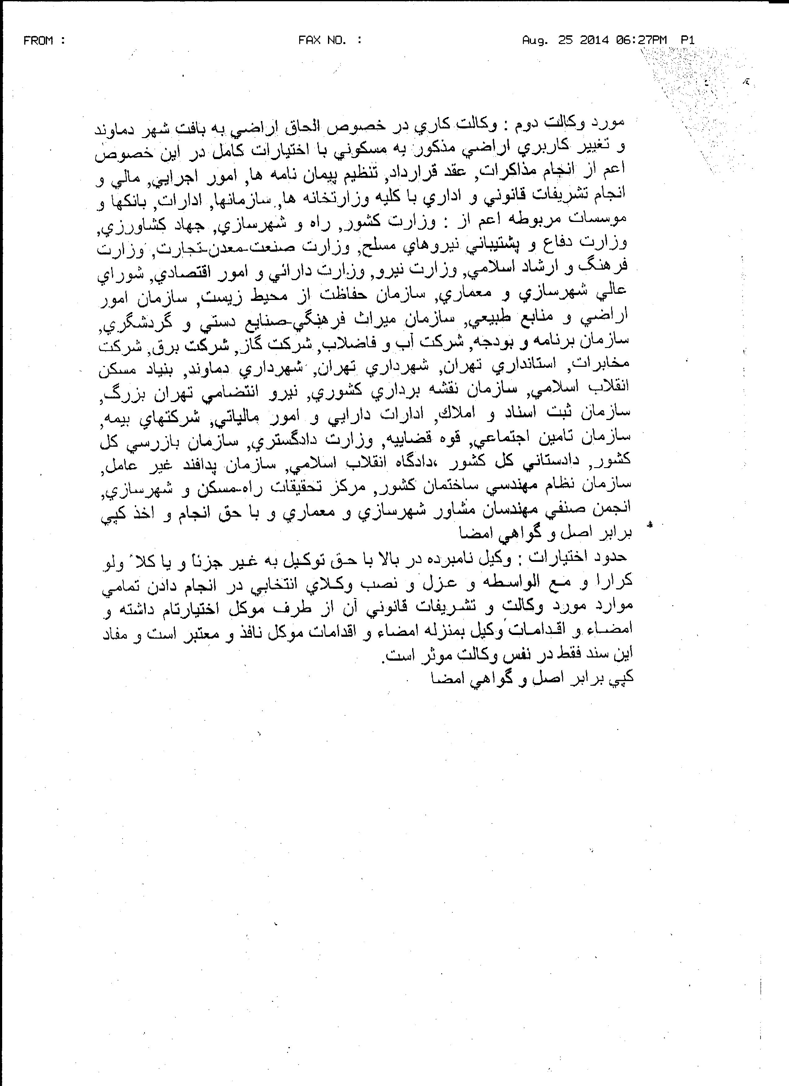 به همین منظور پس از انجام مقدمات مربوط به موسسه ابتدا در یکی از دفاتر رودهن مدارک و حدود کلی اختیارات وکیل تسلیم گردید که متأسفانه دفتر مذکور پس از حدود سه هفته نه نتها پیش نویس را آماده ننمود بلکه تصویر ارائه شده مدارک را نیز گم کرد. این بار در دفتر دیگری که دوستان معرفی نمودند درخواست مطرح شد و ایشان شاید به دلیل عدم سابقه این مورد، پیش نویسی را که در پیوست خدمتتان تقدیم می گردد را آماده نمودند که بغیر از بخش دوم که تقریباً رونویس تذکرات خود ما بود متن آماده و پرکاربرد معمول خودشان را پیشنهاد ارائه نمودند که بخش عمده ای از محتوای آن بی ارتباط با حدود مورد نظر می باشد.